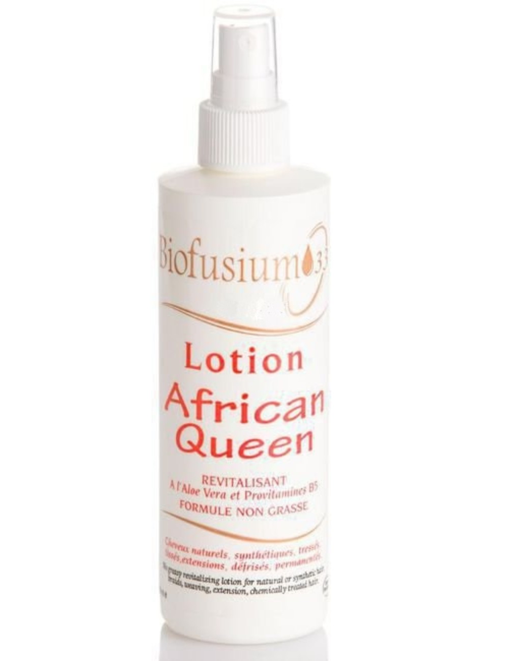 La Lotion revitalisante African Queen de la marque antillaise Biofusium 33 est une lotion fortifiante, conçue particulièrement pour les cheveux afro. La lotion African Queen a pour but de renforcer en profondeur la fibre capillaire pour une meilleure longévité de vos coiffures tressées. Les cheveux afro-antillais qu'ils soient tissés, tressés ou nattés, ont souvent les longueurs et les pointes cassantes et fragiles. Cette lotion composée de romarin, d'ortie et d'aloe vera convient aux cheveux afro-caribéens naturels. enrichie en provitamines B5, aux extraits végétaux et à l'aloe vera, ce qui lui confère des vertus cicatrisantes, revitalisantes, réparatrices et hydratantes. Ces actifs donnent naissance à une formule exempte de paraben, non grasse et très riche en provitamines B5 qui revitalisent et réparent les pointes de vos cheveux. Une légère application au quotidien, suivie de massages en mouvements circulaires au niveau des racines, apporte un aspect de brillance à vos tresses et hydrate vos cheveux. La Lotion African Queen de Biofusium33 est idéale pour faciliter le démêlage de vos cheveux fournis tressés, tissés ou nattés.