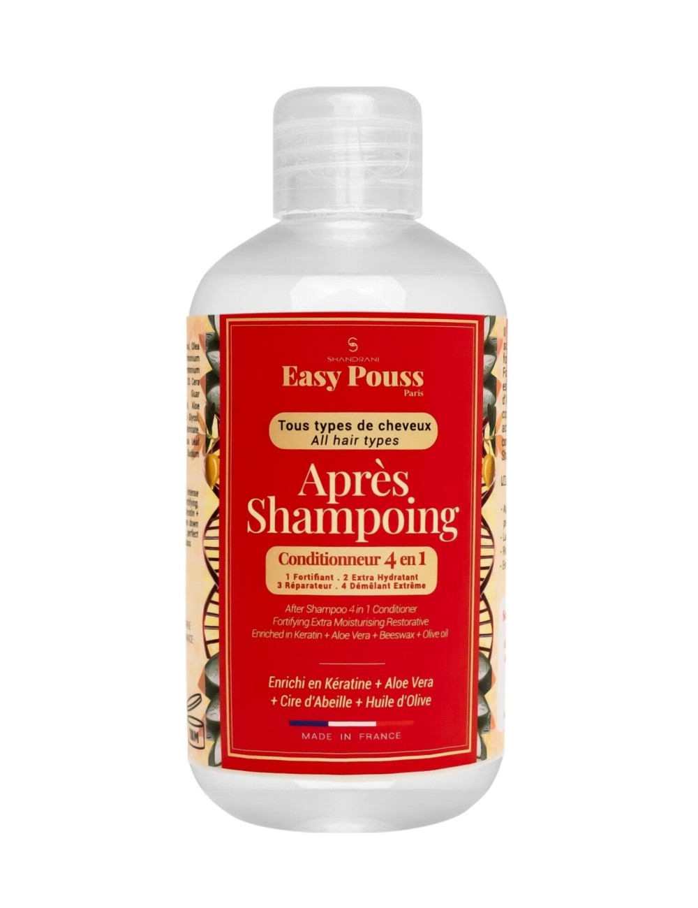 Donnez un coup de pouce à vos cheveux avec lAprès-Shampoing Anti-Chute de Easy Pouss. Si vos cheveux sont cassants et que vous en perdez beaucoup à chaque brossage, cet après-shampoing peut être une solution. Enrichi en kératine, cire dabeille et Aloe Vera, lAprès-Shampoing Anti-Chute de Easy Pouss contribue au renforcement de la fibre capillaire et maintien lhydratation pour des cheveux qui sont durablement protégés. Utilisez cet après-shampoing après votre shampoing pour voir vos cheveux sassouplir instantanément. En usage régulier, il assure une reconstruction du cheveu grâce à la kératine quil contient.