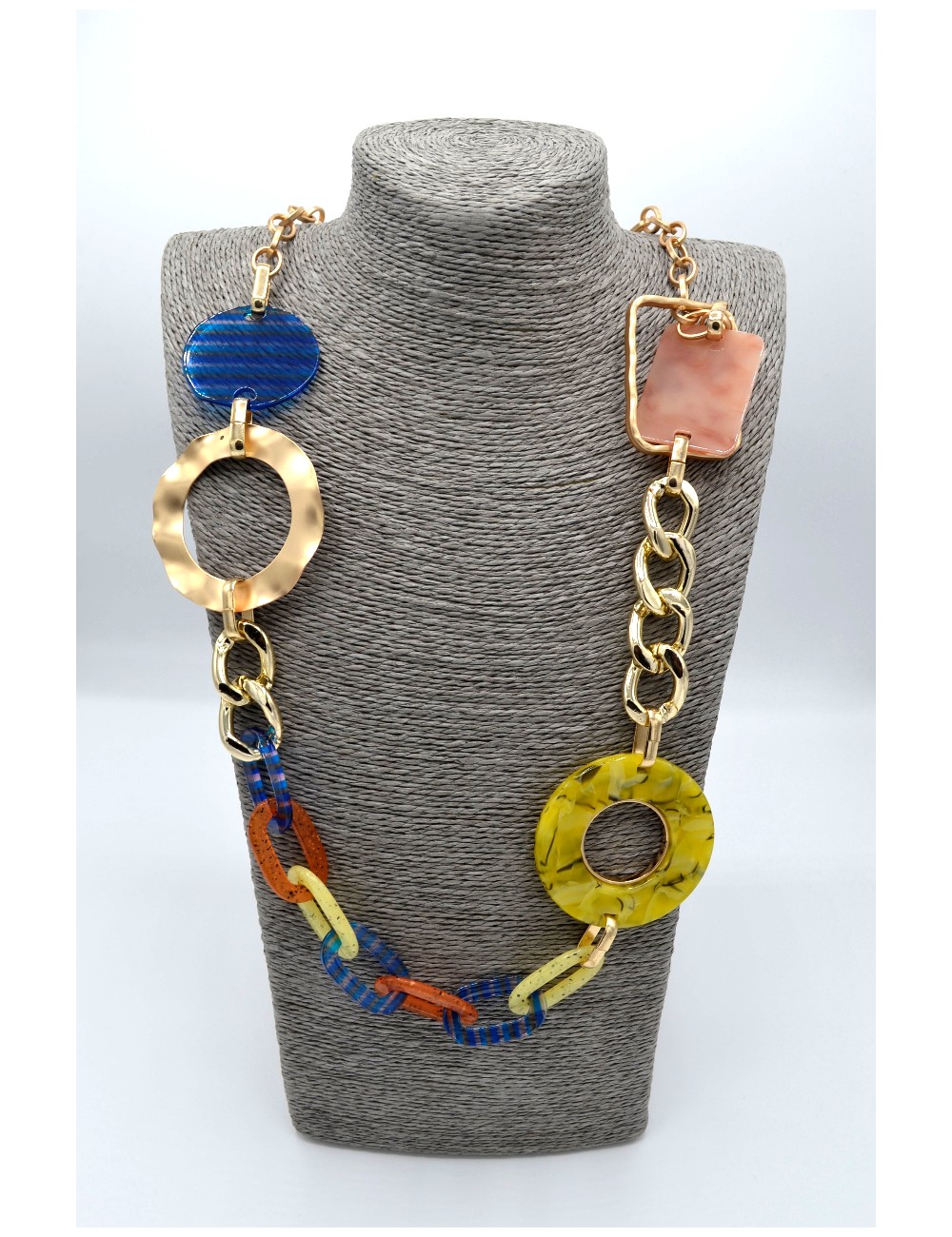 Un sautoir omnicolore, léger de 116 g, il est caractérisé par sa facilité à s’harmoniser aux différentes tenues.
